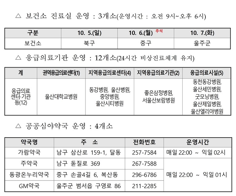 응급의료 공백을 막기 위해 울산대학교병원 등 12개 응급의료기관을 24시간 비상진료체계로 운영하고, 일평균 병·의원 148곳, 약국 135곳, 공공심야약국 4곳이 문을 연다. 다만, 이용 전 필히 의료기관 및 약국 유선 연락 후 방문하길 권장한다.