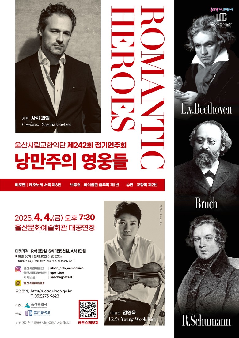 ‘낭만주의 영웅들(Romantic Heroes)’ [울산 세계타임즈=이호근 기자] 울산시립교향악단은 오는 4월 4일(금) 오후 7시 30분 울산문화예술회관 대공연장에서 제242회 정기연주회 ‘낭만주의 영웅들(Romantic Heroes)’ 무대를 마련한다.