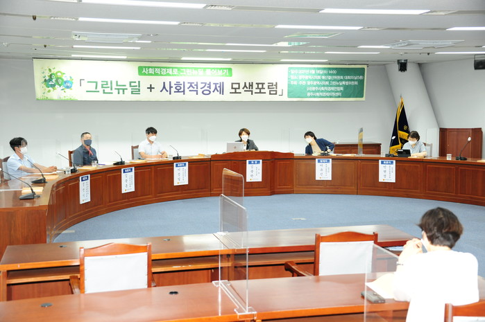 [광주=세계타임즈 손권일 기자] 18일, 광주시의회 예결특위회의실에서 광주시의회 그린뉴딜특별위원회와 (사)광주사회적경제연합회, 광주사회적경제지원센터가 함께 「그린뉴딜+사회적경제 모색포럼」을 개최했다.