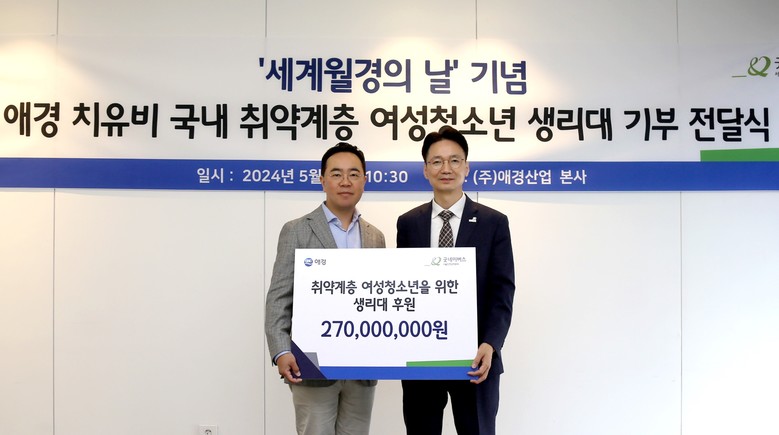 [세계타임즈 = 이현진 기자] ‘사랑(愛)과 존경(敬)’의 기업 애경산업의 여성 바이오 브랜드 ‘치유비’(ChiuuB)가 글로벌 아동권리 전문 NGO 굿네이버스와 지난 24일 서울시 마포구에 소재한 애경산업 본사에서 취약계층 여성청소년을 위한 생리대 기부 전달식을 진행했다고 26일 밝혔다.