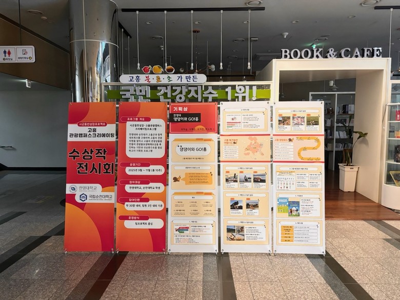 [고흥군 세계타임즈=우덕현 기자] 고흥군(군수 공영민)은 여수 한영대학교와 순천대학교 학생들이 참여해 개발한 ‘2025 고흥 관광 브랜딩 및 크리에이팅 프로그램’의 결과물을 지난 8일부터 고흥군청 1층 로비에서 전시하고 있다고 밝혔다.