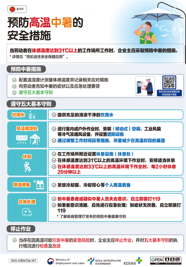 - 폭염특보 발령 시, 건설 근로자 휴식 시간 보장 등 집중점검… 8개 국어로 안전수칙 배포