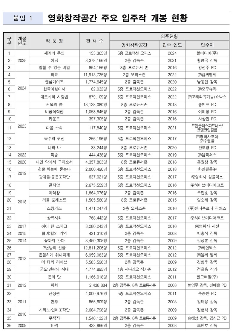 2008년 개관한 영화창작공간은 독립영화부터 상업영화, 시리즈 콘텐츠까지 폭넓은 작품을 배출하며 한국 영화 기획·개발의 핵심 인프라로 자리매김해 왔다. 그간 <파묘>, <7번방의 선물> 등 총 321편의 영화가 이곳에서 기획·개발돼 개봉하는 성과를 거뒀다.