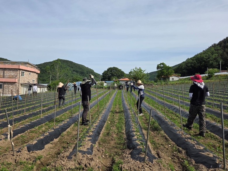일손돕기에는 진안읍을 비롯해 농촌활력과, 사회복지과, 가족행복과 소속 직원 30여명이 함께 참여해 농작업이 어려운 농가를 위해 총 1,500평의 농지에 고추 지주목 세우기를 진행했다.