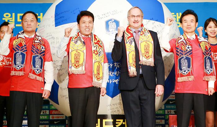 함영주 KEB하나은행장은 국민들이 월드컵 9회 연속 본선진출을 염원하며 응원의 메시지를 자필로 담은 대형 축구공을 붉은악마 회원들과 함께 슈틸리케 감독에게 전달하며 승리를 기원했다.