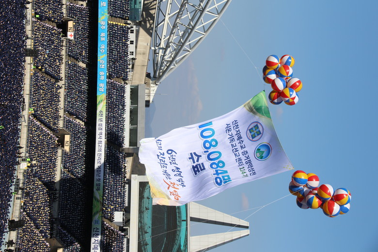 [세계타임즈 = 백진욱 기자] 11월 12일 대구스타디움에서 신천지 예수교 증거장막성전(신천지 예수교회)이 시온기독교선교센터 114기 10만 수료식을 개최한 가운데 수료식을 기념하는 플랜카드가 대구스타디움 상공에 휘날리고 있다. 신천지 예수교회에 따르면, 이날 수료식에는 수료생 8만 명, 축하객 1만 명, 안전요원 및 스텝 1만 4천 명, 차량 총 2천 200대가 동원됐다.