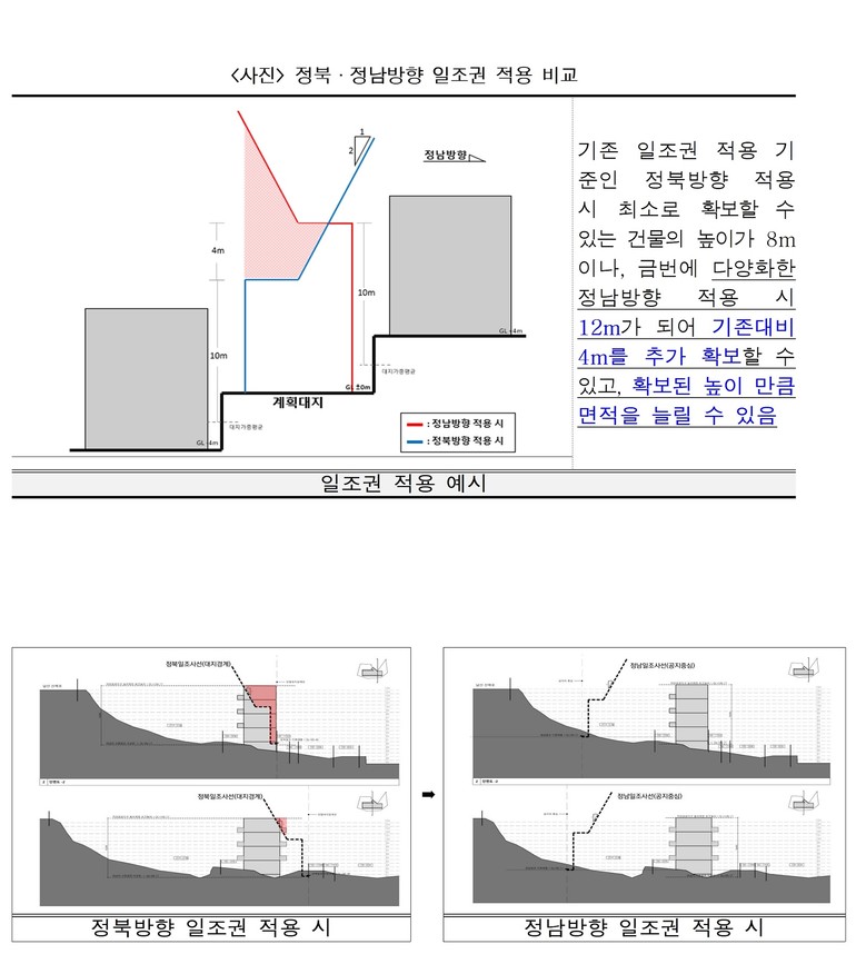 이번 고시에 따라 △정북방향으로 접하고 있는 대지의 소유자와 합의하거나 △정북방향으로 도로, 공원, 하천 등 건축이 금지된 공지에 접하는 대지인 경우, 정남방향 일조권 적용이 가능해졌다.