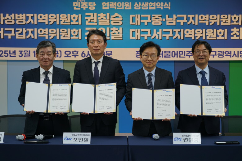 권칠승 의원은 지난 14 일 더불어민주당 대구시당에서 허소 대구시당 위원장 ( 중ㆍ남구 지역위원장 ) 과 ‘ 협력의원단 상생협약식 ’ 을 개최했다 . 이날 행사는 더불어민주당 조인철 국회의원 ( 광주서구갑 ) 과 최규식 서구 지역위원장도 참석한 합동 협약식으로 진행해 동서 화합의 기대를 높였다 .