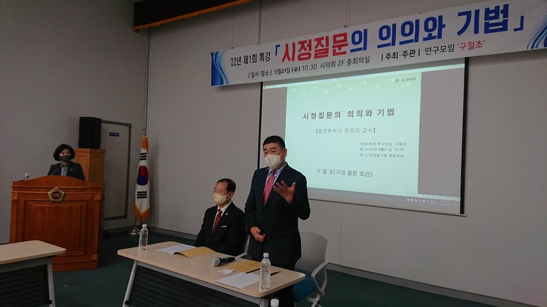 모임의 대표인 강달수 의원(사하구2)은 본회의에서 의원들이 개별적으로 직접 논의를 전개하는 시정질문에 대한 초선의원들의 자질향상을 위하여 이번 강연회 자리를 마련하였다.