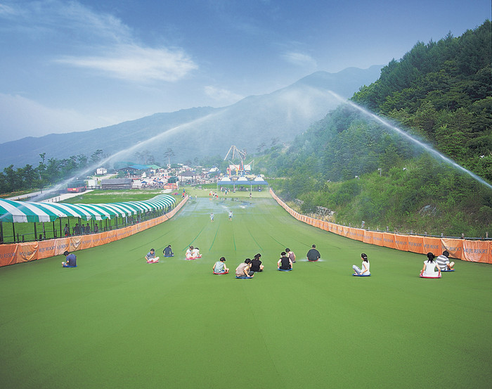 길이 120m, 폭30m로 크고 작은 무지개를 형성하는 약한 물줄기와 강한 물줄기가 동시에 뿜어져 나와 한층 재미를 더한다. 물썰매로 짜릿한 스릴과 쾌감을 느끼며 무더위를 날려보자.