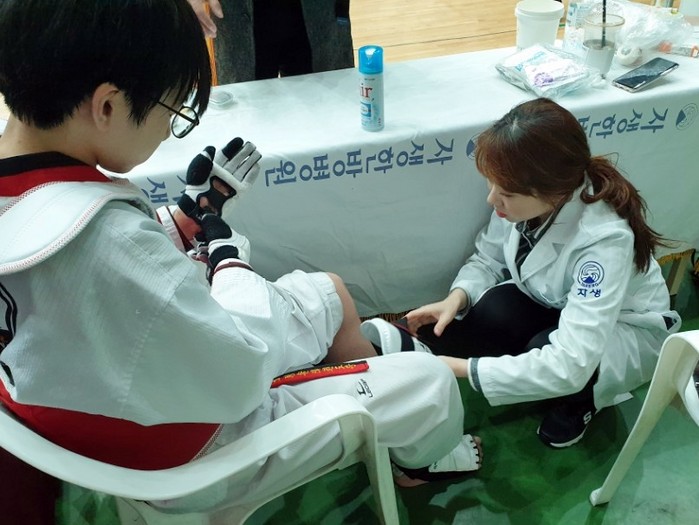 태권도는 발차기 동작이 많은 종목 특성상 발과 무릎에 근육·인대손상, 염좌 등 부상이 자주 발생하는 스포츠다. 이번 대회에서도 진료소를 찾은 선수의 대부분이 돌려차기나 옆차기 중 부상을 입은 경우였다. 손상된 근육이나 인대를 제때 치료하지 않으면 연골 손상이나 관절염 등 2차 질환으로 발전할 수 있기 때문에 신속한 처치가 필요하다.