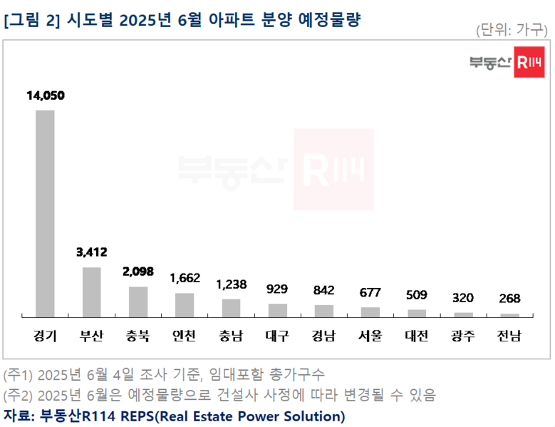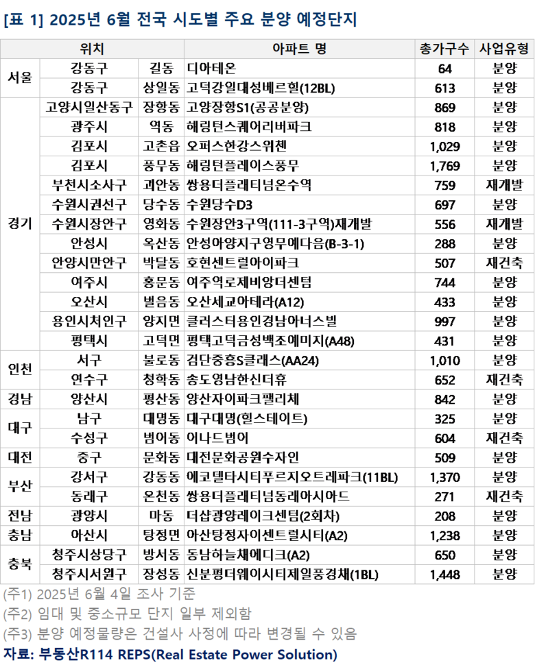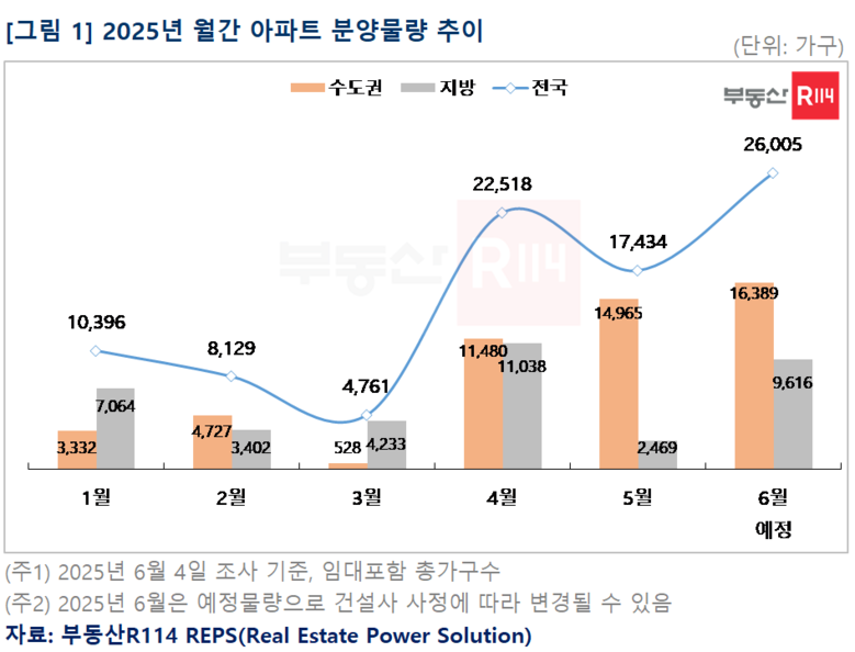 [세계타임즈 = 심귀영 기자] 부동산R114(www.r114.com) 조사에 따르면 6월 전국에서 2만6,005가구(임대포함 총가구수)의 분양물량이 예고됐다. 올해 월간 기준으로는 최대 물량이며, 전월(1.7만) 및 작년 동기(1.6만) 대비 비교해도 8~9천가구 많은 수준이다. 작년 12.3 비상계엄부터 올해 4.4 탄핵 인용까지 국내 정치적 불확실성 고조로 분양 공급 일정이 크게 지연됐지만, 6.3 대통령 선거 결과로 정치적 불확실성이 해소되면서 건설사들도 본격적으로 지연됐던 물량들을 쏟아내는 모양새다. 6월에는 수도권은 물론 지방에서도 과거 대비 많은 물량이 예고된 만큼 수요자의 내 집 마련 선택지가 보다 다양해질 전망이다.