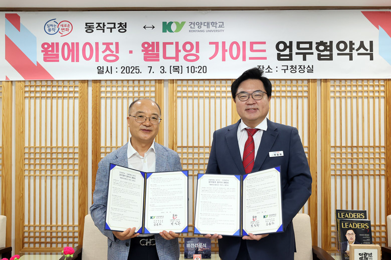 구에 따르면 협약식은 지난 3일(목) 오전 구청장실에서 열렸으며, 이날 박일하 동작구청장과 김광환 건양대학교 웰다잉융합연구소 소장이 참석해 내실 있는 학과 운영을 위한 상호협력을 약속했다.