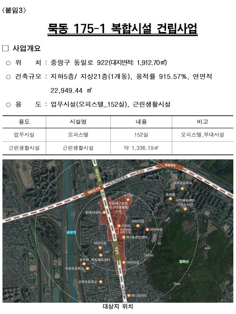 중랑구 묵동 먹골역 인근엔 지하 5층·지상 21층 규모 복합시설이 들어선다. 공공임대 오피스텔 152실과 함께 저층부에 근린생활시설 약 1,300㎡가 조성된다.