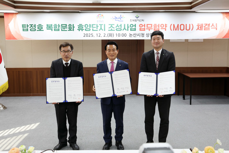 도는 2일 논산시청 상황실에서 전형식 도 정무부지사, 백성현 논산시장, 김정호 ㈜한국토지신탁 신탁사업2본부장이 ‘탑정호 복합문화 휴양단지 조성’ 업무협약을 체결했다고 밝혔다.