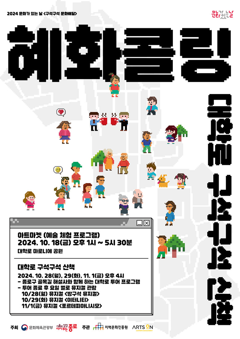 [혜화콜링=세계타임즈 이상호 기자] 문화체육관광부와 종로구가 주최하고 지역문화진흥원, ㈜아츠온 이 주관하는 <2024 문화가 있는 날 구석구석 문화배달 “혜화콜링”/이하 구석구석 문화배달 “혜화콜링”>이 오는 10월 프로그램으로 대학로 문화지구 일대에서 <대학로 구석구석 산책>을 개최한다.