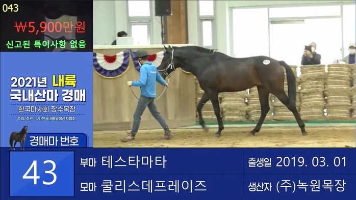 이번 경매에는 총 50두가 상장돼 최종 13두가 낙찰되며 약 26%의 낙찰률을 기록했다. 최고가를 기록한 말은 부마 ‘테스타마타’, 모마 ‘클리스데프레이즈’ 사이에서 태어난 수말로 6,000만원에 낙찰되며 새 주인을 맞이했다.