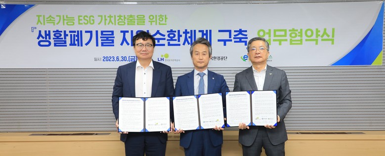 [세계타임즈 = 심귀영 기자] 한국토지주택공사(LH)는 30일, 전국 보상현장에서 발생되는 생활폐기물로 인한 환경오염, 처리비용 등 문제 해결을 위해 한국환경공단, E-순환거버넌스와 ‘생활폐기물 자원순환체계 구축을 위한 업무협약’을 체결했다.