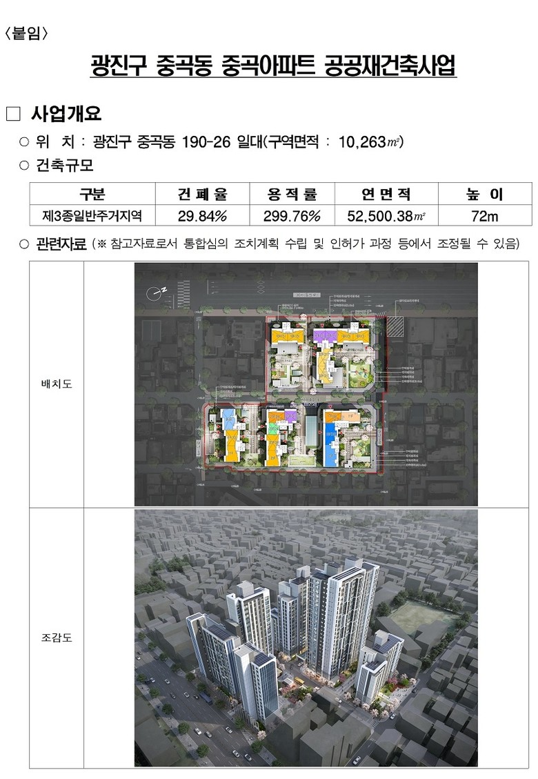 1976년 준공된 지상 5층 규모의 낡고 거주환경이 열악한 중곡아파트를 지상 최고 25층, 5개 동, 348세대(공공주택 44세대 포함)로 재건축하는 정비계획을 ’24년도에 이미 확정했었고, 특별건축구역으로 지정 및 사업시행계획을 위한 통합심의도 통과되었다.
