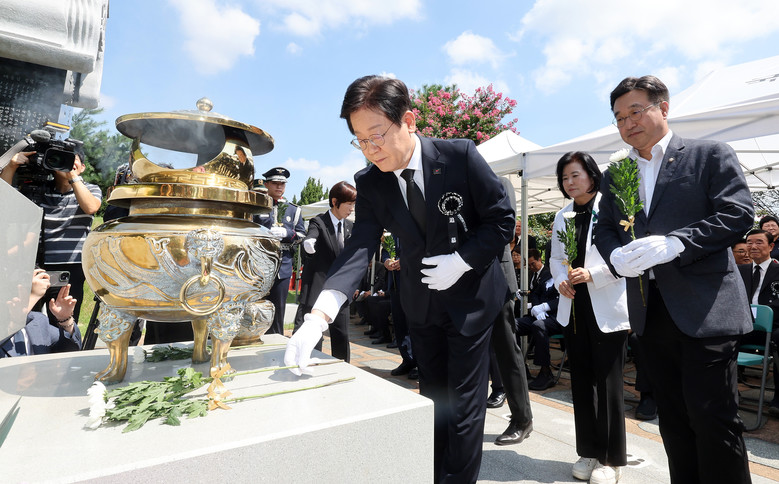 [세계타임즈 = 심귀영 기자] 더불어민주당 이재명 전 대표가 18일 오전 국립서울현충원에서 열린 김대중 전 대통령 서거 15주기 추모식에 참석해 헌화하고 있다. 2024.8.18
