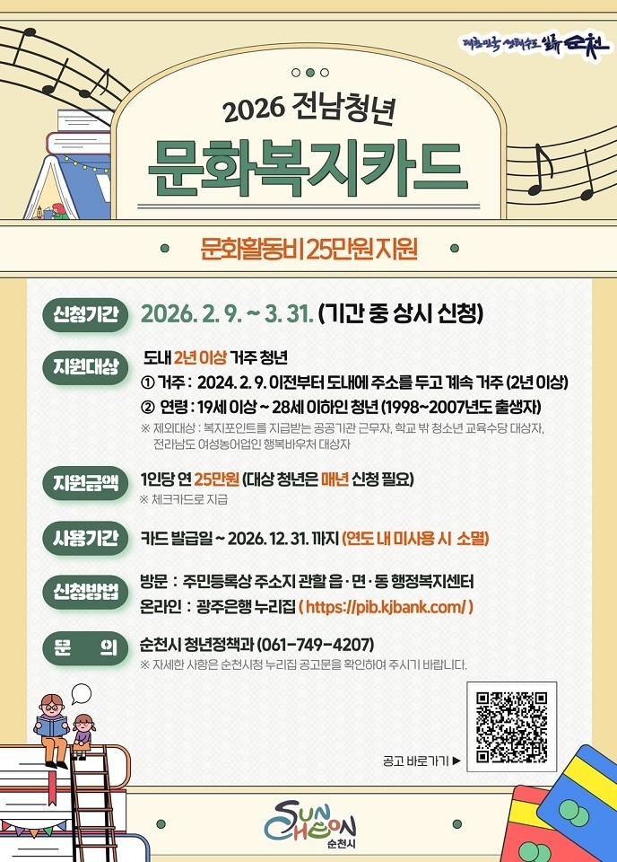 자세한 내용은 순천시청 누리집 고시.공고란을 참고하거나 순천시 청년정책과 청년지원팀 또는 읍면동 행정복지센터로 문의하면 된다.