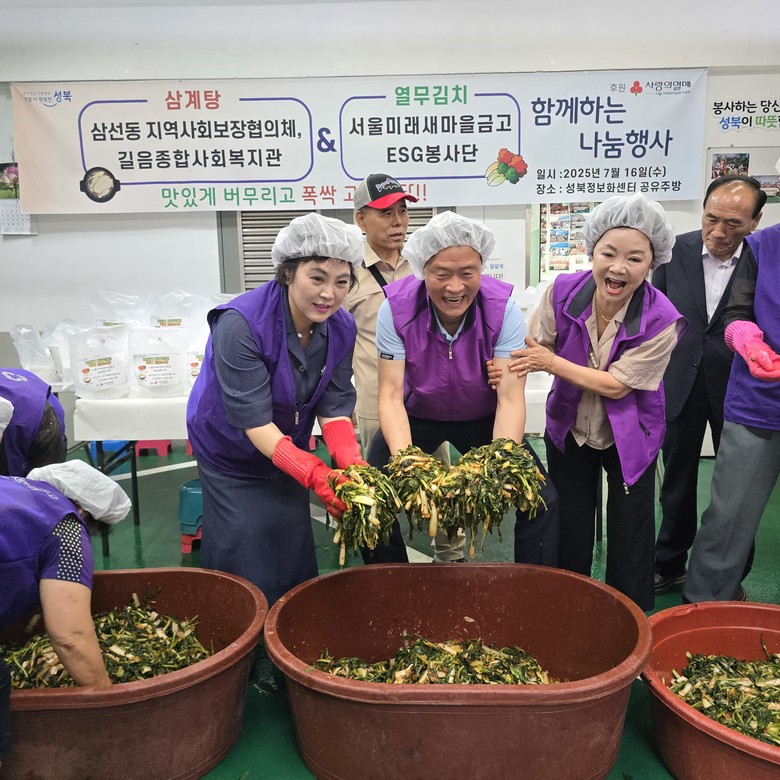 7월 16일, 삼선동 정보화센터 공유주방에서 삼선동지역사회보장협의체, 길음종합사회복지관, 서울미래새마을금고 ESG봉사단 등 50여 명이 참여한 ‘삼계탕 & 열무김치 나눔행사’가 열렸다. 이들은 관내 경로당 4곳과 홀몸 어르신, 취약계층 180가구에 삼계탕과 열무김치를 직접 조리해 전달하며 여름철 건강을 챙겼다. 이번 나눔행사는 서울미래새마을금고의 후원과 민·관이 함께 손잡고 이뤄낸 협력 사례로, 단순 지원을 넘어 지역 내 연대감을 높이는 계기가 되었다. 이승로 성북구청장은 “폭염 시기에 의미 있는 나눔이 이루어졌다”라며 감사를 전했고, 현상례 지역사회보장협의체 위원장은 “앞으로도 실질적인 지원을 지속해가겠다”라고 밝혔다. 이번 행사는 서울미래새마을금고의 후원으로 복지 사각지대 해소에 기여했다.