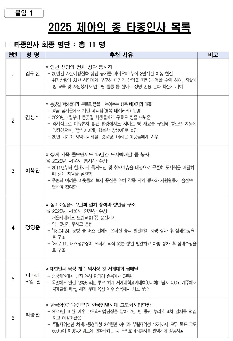 - 2차례 행인을 구조한 버스기사, 25년간 자살예방 상담봉사자, 노면 색깔 유도선 개발자 등