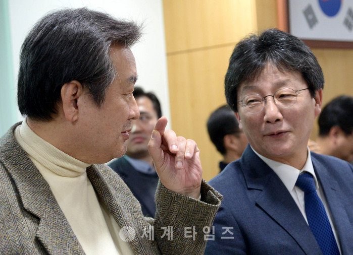 8일 오전 서울 여의도 국회 의원회관에서 열린 개혁보수신당(가칭) 당명채택회의에서 김무성 전 대표와 유승민 의원이 참석해 '바른정당'으로 당명이 확정 된 후 웃으며 이야기를 나누고 있다. 2017.01.08.