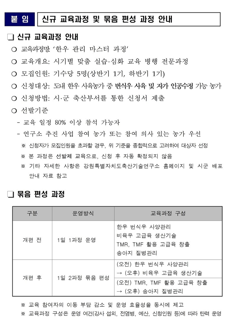 교육 과정별 세부 일정과 신청 방법은 강원특별자치도 축산기술연구소 홈페이지에 게시할 예정이다. 아울러 시군 축산부서에서는 연구소가 제작한 안내 자료를 배부하고 교육 신청을 접수해 농가의 접근성과 편의성을 높일 계획이다.