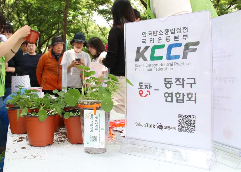 지난 20일 서울 보라매공원 한 켠이 시민들로 북적였다. 한국탄소중립실천국민운동본부 동작구연합회(연합회장 김은경)가 주최한 ‘탄소중립을 위한 작은 정원’ 행사가 열린 현장에는 테이크아웃 컵을 손에 든 주민들이 길게 줄을 섰다. 일회용 컵을 가져오면 귀여운 수생식물 ‘워터코인’을 담은 화분을 나눠주는 방식이다.