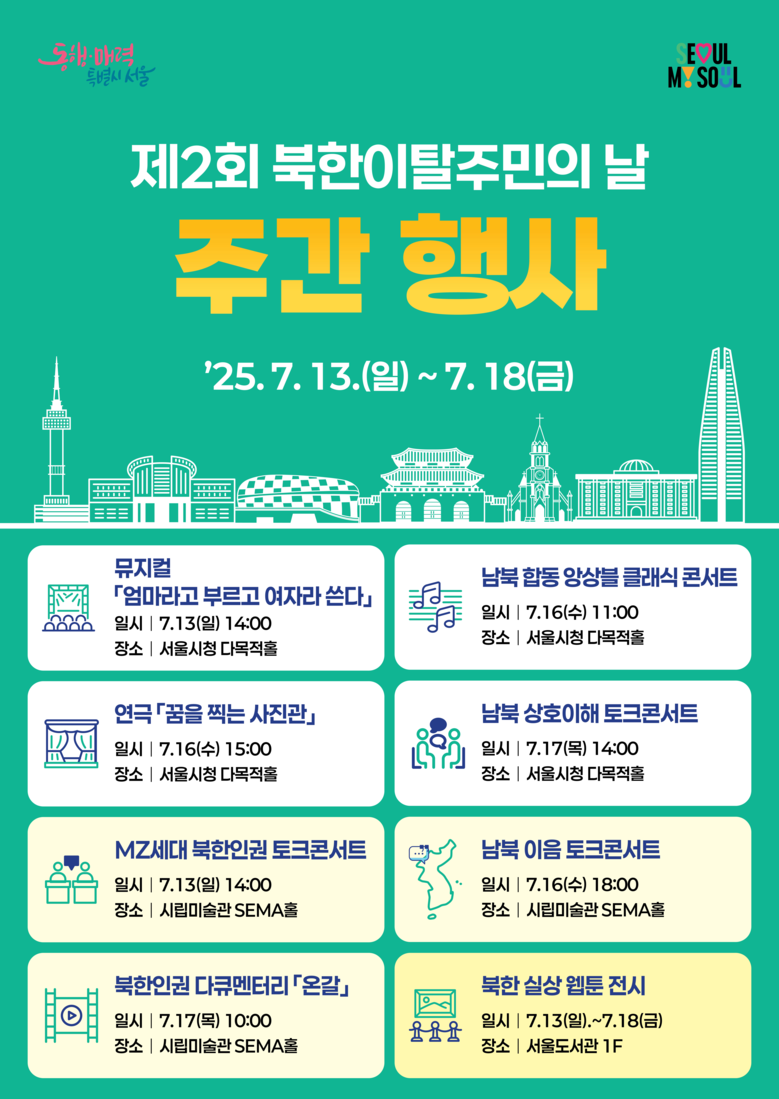서울시는 7.13.(일)~7.18.(금) 서울시청, 서울시립미술관, 서울도서관 등에서 ‘제2회 북한이탈주민의 날’ 주간 시민공감 문화행사를 연다고 밝혔다. 지난해 서울시가 지자체 최초로 개최한 북한인권 포럼을 비롯해 뮤지컬, 연극, 콘서트, 전시 등 다양한 행사가 개최된다.