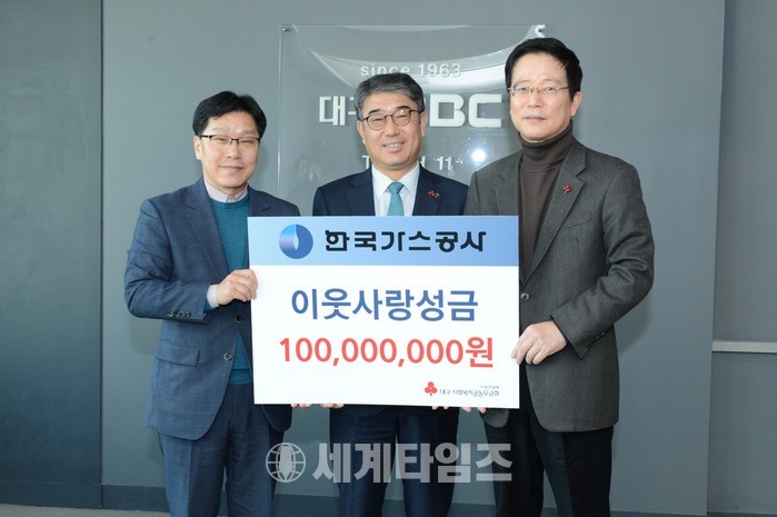 [세계타임즈 양준호 기자]한국가스공사(사장 직무대리 안완기)가 지난 18일 대구MBC와 대구사회복지공동모금회가 함께하는 ‘희망 2018 나눔 캠페인’에서 불우이웃돕기 성금 1억원을 기탁했다.
