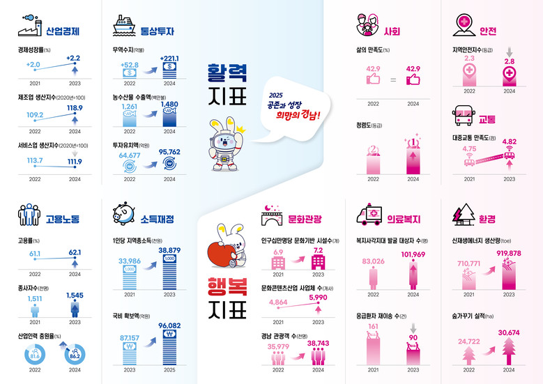 이번에 공개한 지표는 도민이 변화를 체감할 수 있도록 ‘활력지표’와 ‘행복지표’ 각 11개씩으로 구성됐다. 지표는 대표성, 도민 체감도, 변동 가능성 등을 고려해 선정됐다.