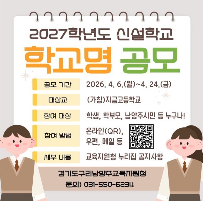 교명 공모는 학생, 학부모, 교직원, 지역주민 등 누구나 참여할 수 있으며 공모 기간은 2026년 4월 6일(월)부터 4월 24일(금)까지이다.