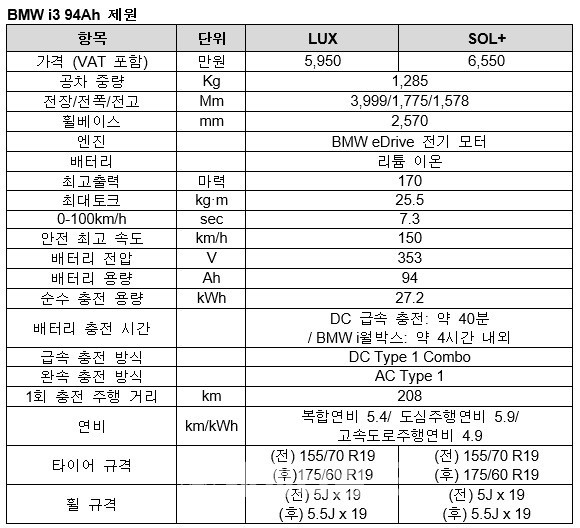 가격은 ‘i3 94Ah LUX’모델이 5,950만원, ‘i3 94Ah SOL+’ 모델이 6,550만원이며, 모든 모델에는 8년 또는 주행거리 10만km까지 배터리 품질이 보증 된다(VAT 포함).