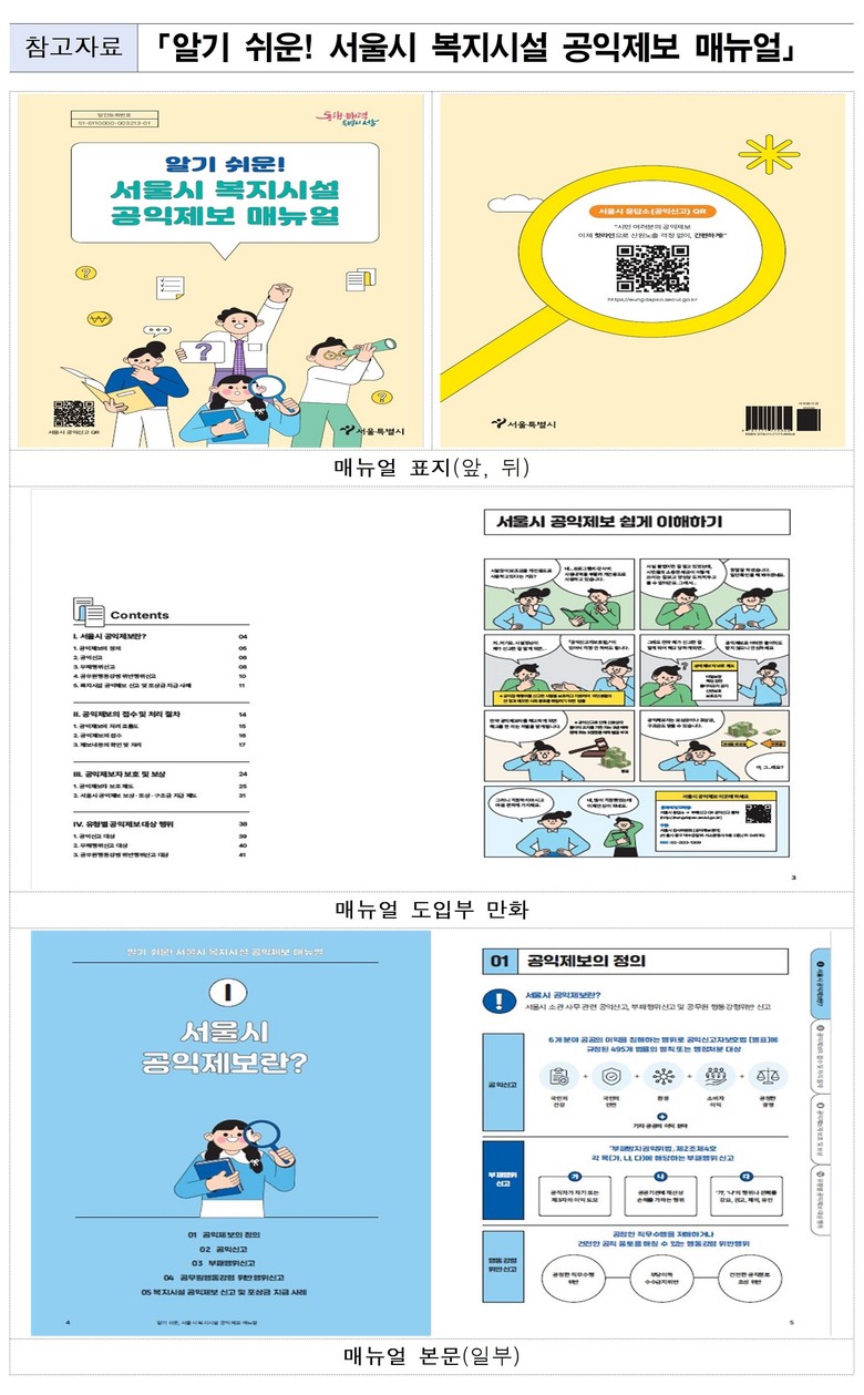 - 7월 내 복지관 중심으로 책자 배부, 서울도서관·자치구 누리집 등에 전자파일 게시 [서울 세계타임즈=이장성 기자] 서울시 관내 복지시설 운영자와 종사자가 공익제보 규정을 잘 인지하고 활용할 수 있도록 관련 매뉴얼이 발간된다. 매뉴얼은 누구나 쉽게 찾아볼 수 있도록 7월 내에 서울도서관과 서울시 자치구 누리집 등에 전자파일로 게시될 예정이다.
