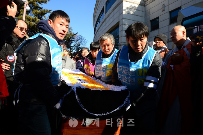 14일 오전 서울 종로구 서울대병원 장례식장에서 열린 정원 스님 발인식에서 박근혜퇴진비상국민행동 회원들이 고인을 운구하고 있다. 정원스님은 지난 7일 촛불집회 현자에서 ‘박근혜 대통령 체포’를 요구하며 분신했다. 2017.01.14