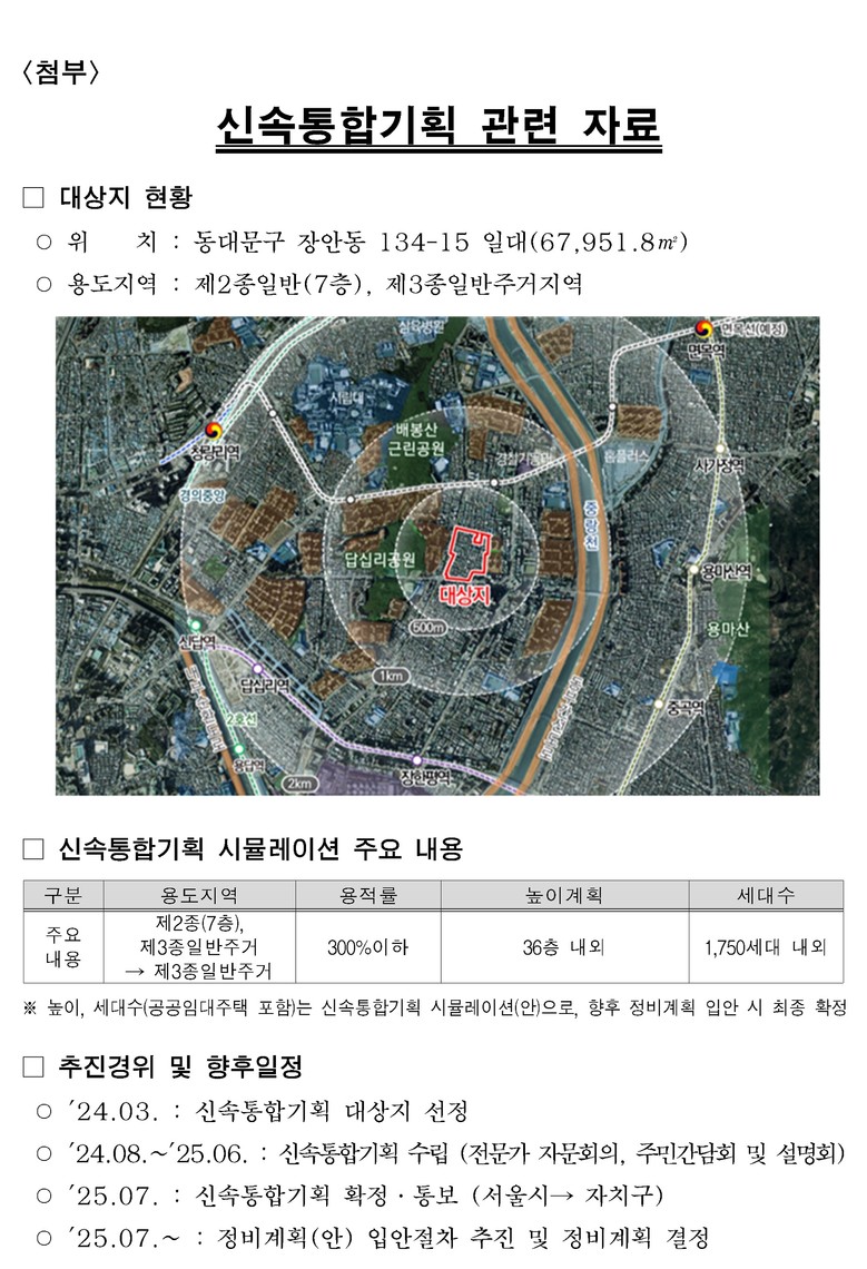 서울시는 신속통합기획이 확정된 장안동 134-15번지 일대의 정비계획이 빠르게 수립될 수 있도록 앞으로 적극 지원해 나간다는 방침이다. 특히 ‘신속통합기획 절차 간소화’로 도시계획수권분과위원회, 사업시행계획 통합심의가 가능해지면서 사업 기간 단축 효과도 기대된다.