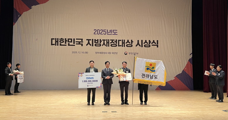 [전남 세계타임즈=우덕현 기자] 전라남도는 16일 정부세종청사에서 열린 행정안전부의 2025년 제18회 대한민국 지방재정대상 시상식에서 ‘통합재정운영평가’ 분야 대상(대통령상)을 받아, 재정인센티브 10억 원을 확보했다고 밝혔다.