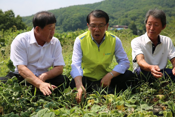 | ▲ NH농협생명 서기봉 사장(가운데)이 폭염 피해 농가에 방문하여 여주농협 이광수 조합장(왼쪽)을 통해 피해상황을 듣고 있다. |