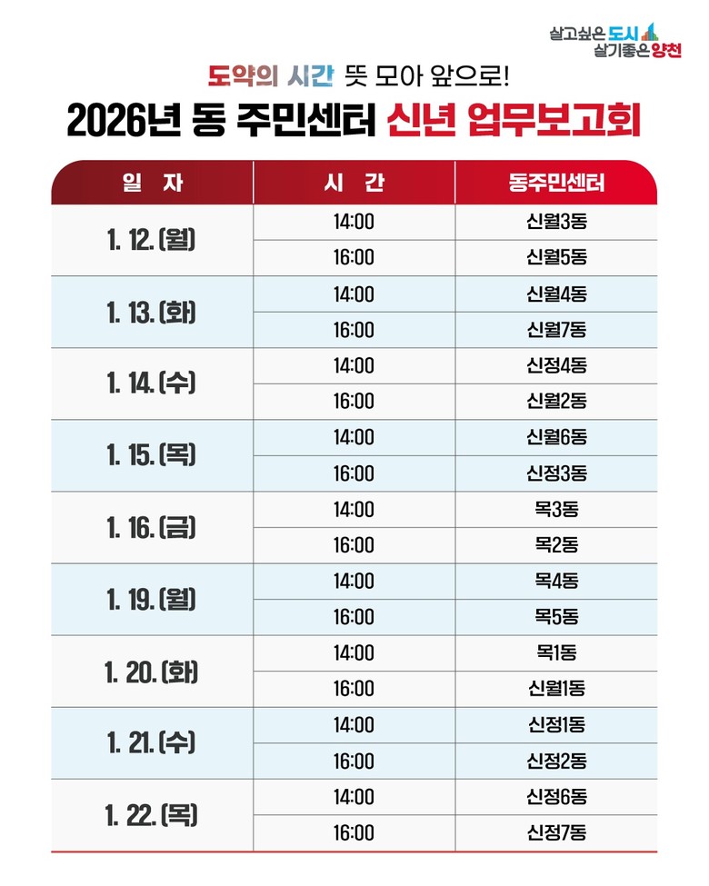 ‘2026년 동 신년 업무보고회’ 개최와 관련한 자세한 사항은 양천구 공식 블로그(https://blog.naver.com/yangcheon2016)에서 확인할 수 있다.