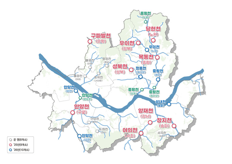 시는 ▴카페폭포를 조성한 홍제천('23.4.)을 시작으로 ▴공유형 수변테라스 도림천('24.5.) ▴피크닉가든 안양천('25.5.) ▴장미카페 묵동천('25.5.) ▴전망카페 ‘재간정’ 우이천('25.10.) ▴드라이브스루카페 구파발천('25.11.) 등 올해까지 총 17곳의 수변활력거점을 조성했다.