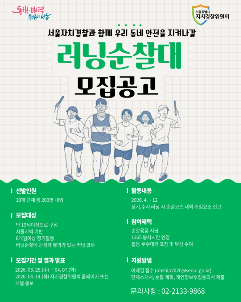 - 4월 7일(화)까지 접수 가능…기본·현장 교육, 순찰용품 지원, 봉사시간 인정, 우수대원 표창 [서울 세계타임즈=이장성 기자] 서울시 자치경찰위원회(이하 서울 자경위)는 러닝을 하며 동네 안전까지 함께 살피는 시민 참여형 활동인 서울 러닝 순찰대에 참여할 2026년 신규 대원을 모집한다. 올해는 10개 단체(크루) 200명 규모로 확대해 운영할 계획이다.