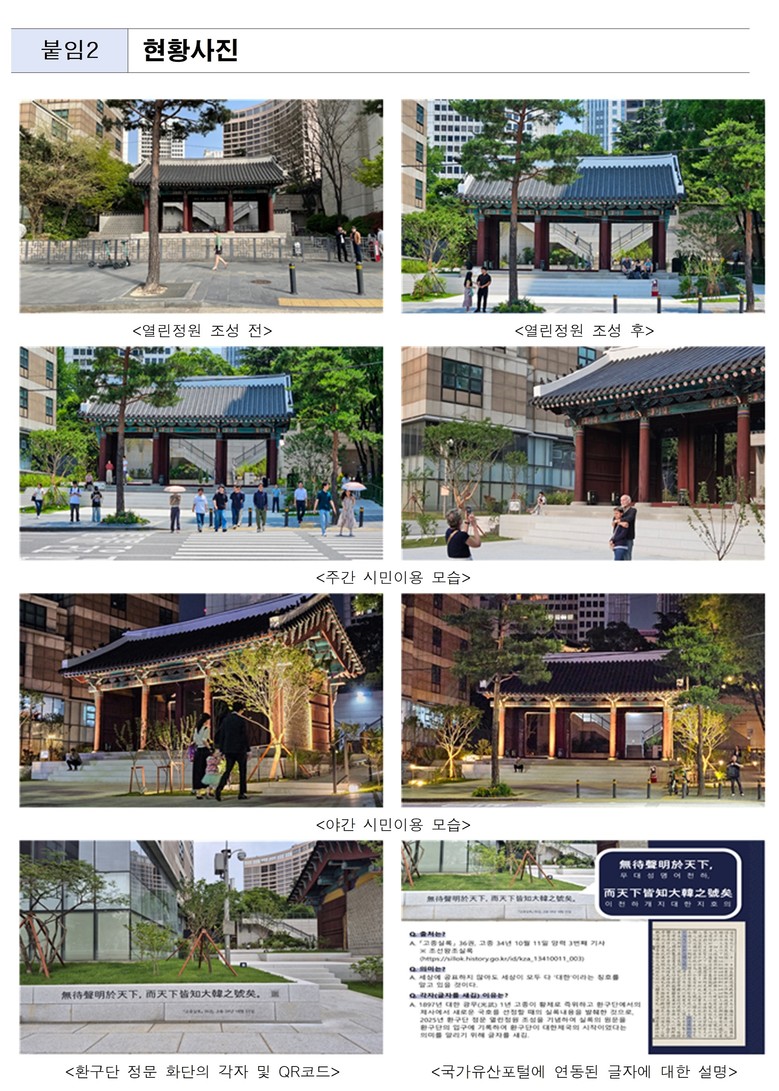 이수연 서울시 정원도시국장은 “환구단 정문이 가진 역사성과 정원의 아름다움을 시민 모두가 일상에서 체감할 수 있는 열린공간으로 되살렸다,”고 말하며 “역사적 가치와 자연과 휴식이 어우러진 새로운 시민 휴식공간이 되길 바란다.”라고 밝혔다.