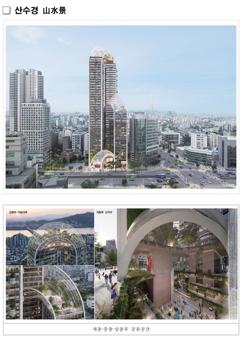 한국적 자연관인 ‘산수’를 디자인 콘셉트로 산과 강을 곡선형 매스로 재해석한 산수경(山水景)은 3개의 열린 공간, 지하철과 입체적으로 연계된 저층부 계획으로 공공성이 극대화돼 시민과 교감하는 천호대로의 상징적인 건축물이 될 것으로 예상된다.