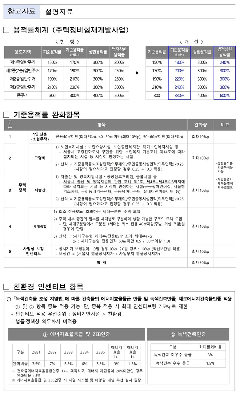 - ‘기준용적률 상향’ 최대 30%, ‘법적상한용적률’ 1.2배로 확대…인센티브 다양화 사업성 강화