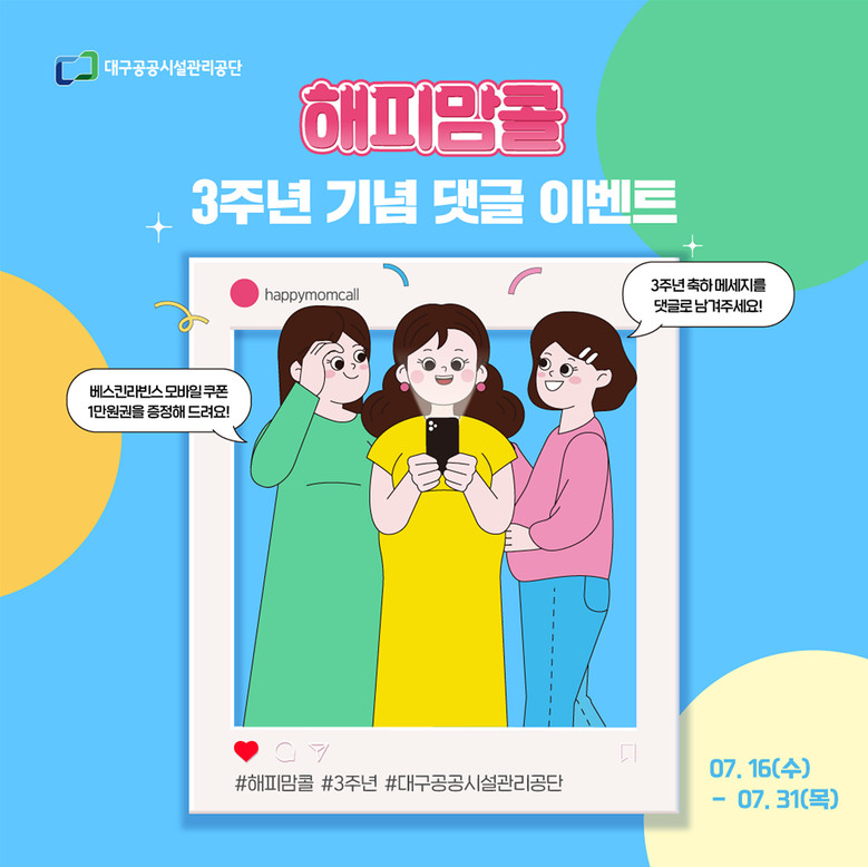 ▸ 인스타그램 통해 시민 참여형 이벤트 진행, 추첨을 통해 모바일 기프티콘 증정 [세계타임즈=대구 한윤석 기자] 대구공공시설관리공단(이사장 문기봉)은 임산부 택시비 지원사업 ‘해피맘콜’ 운영 3주년을 맞아, 7월 16일(수)부터 31일(목)까지 공식 인스타그램을 통한 기념 이벤트를 진행한다고 밝혔다.