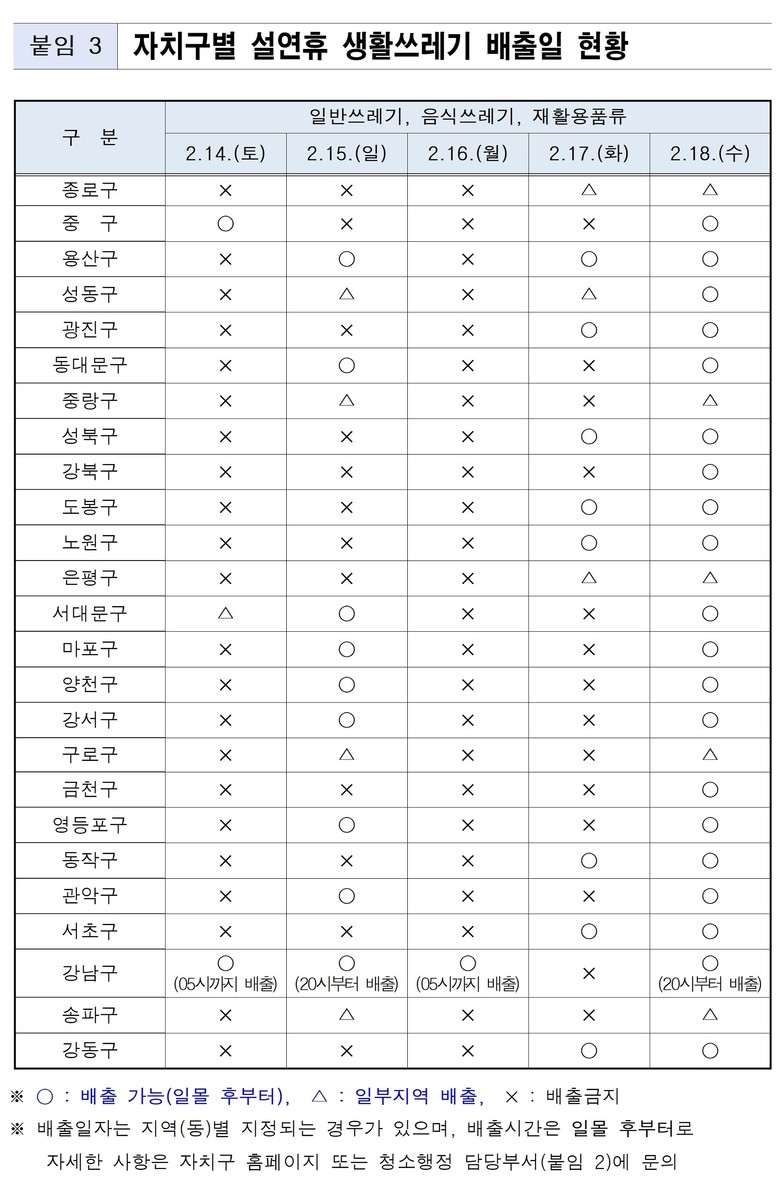 연휴 기간에는 서울시 자원회수시설 반입일과 자치구 환경공무관 휴무 등으로 자치구마다 쓰레기를 배출할 수 있는 날짜가 다르다. 특히 동별로 생활 쓰레기 배출일이 다른 자치구가 있으므로 자치구 누리집 등을 통해 연휴 기간 쓰레기 배출일을 확인해야 한다.