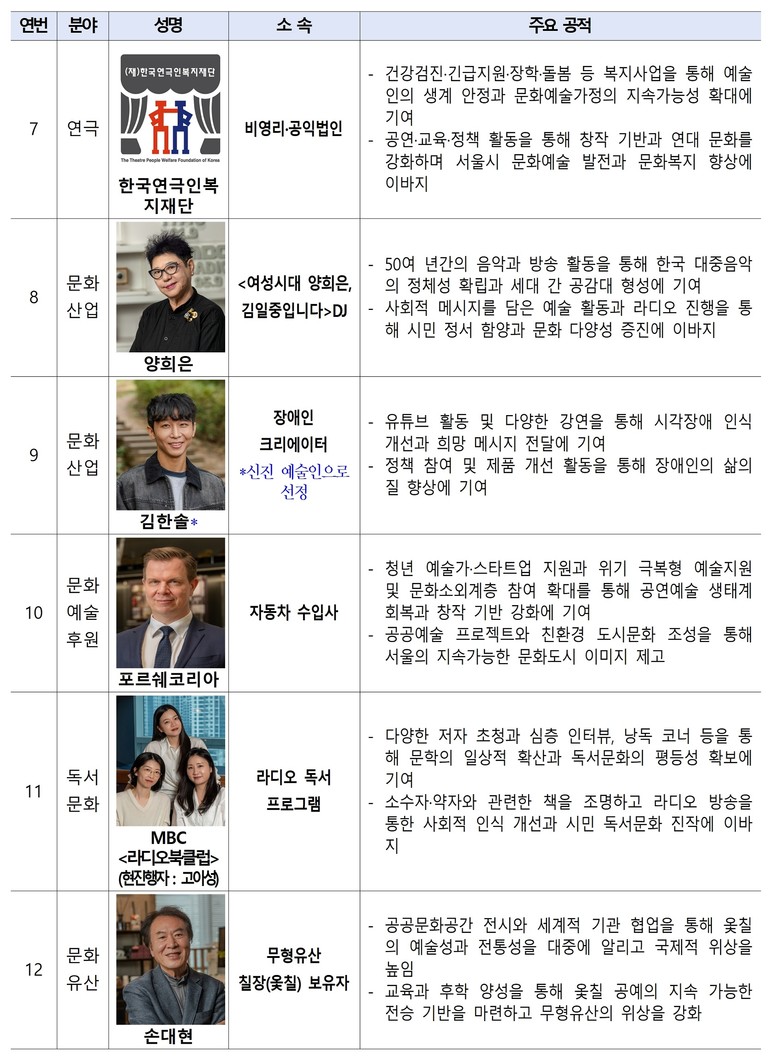 심사에서는 ▴최근 10년간의 문화 발전 기여도, ▴서울시민의 문화생활 향상 기여도 등과 온라인 시민투표 결과를 종합적으로 고려해 최종 수상자를 선정했다.
