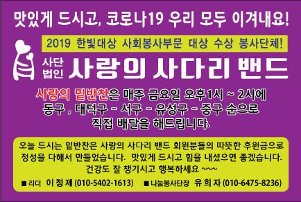 동구지체장애인협회 김연숙 회장은 “코로나19 상황에서도 장애인들을 위해서 매월 1회 맛있는 밑반찬을 지원해주는 사랑의 사다리 밴드 봉사단체에 감사함을 전한다.”고 말했다.